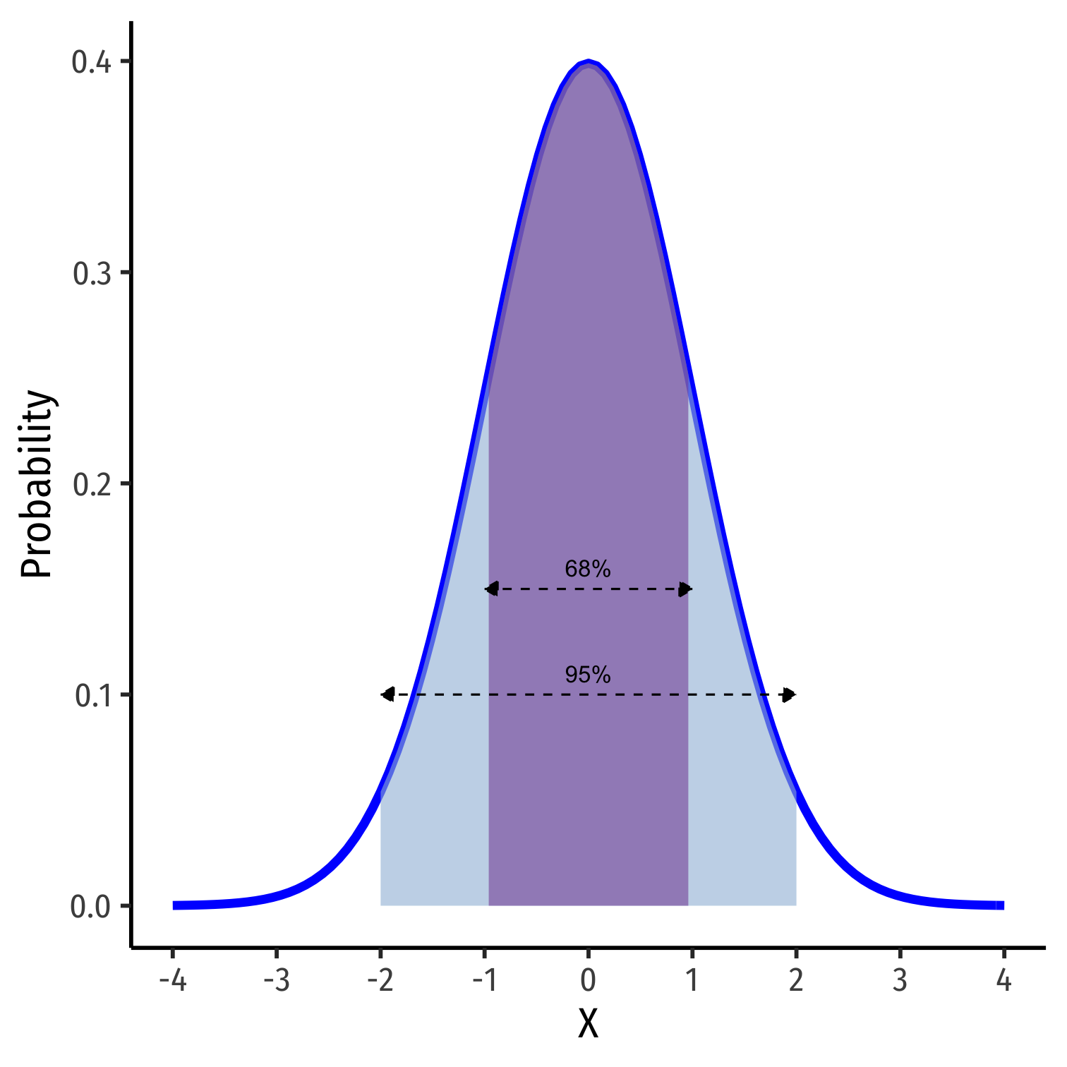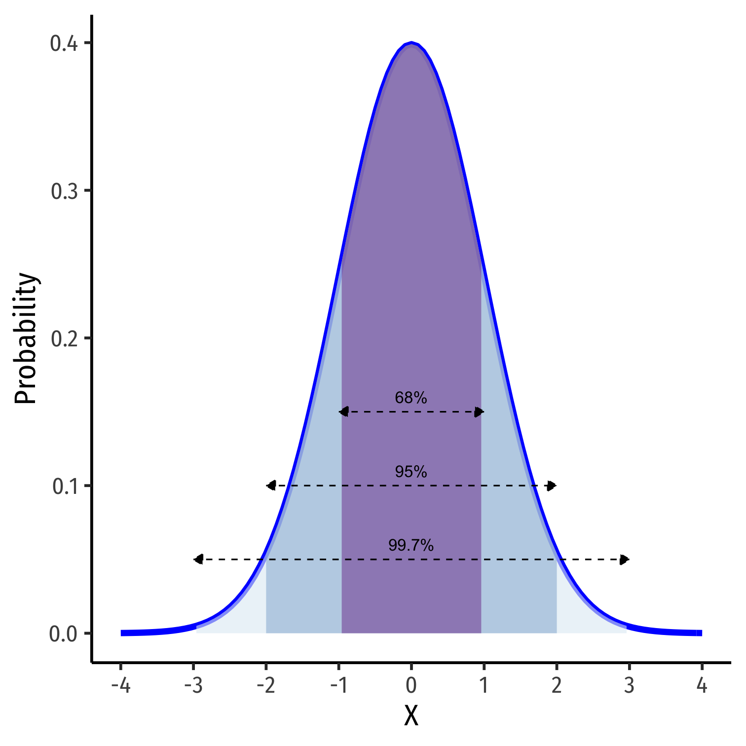 68/95/99.7% of observations fall within 1/2/3 standard deviations of the mean
