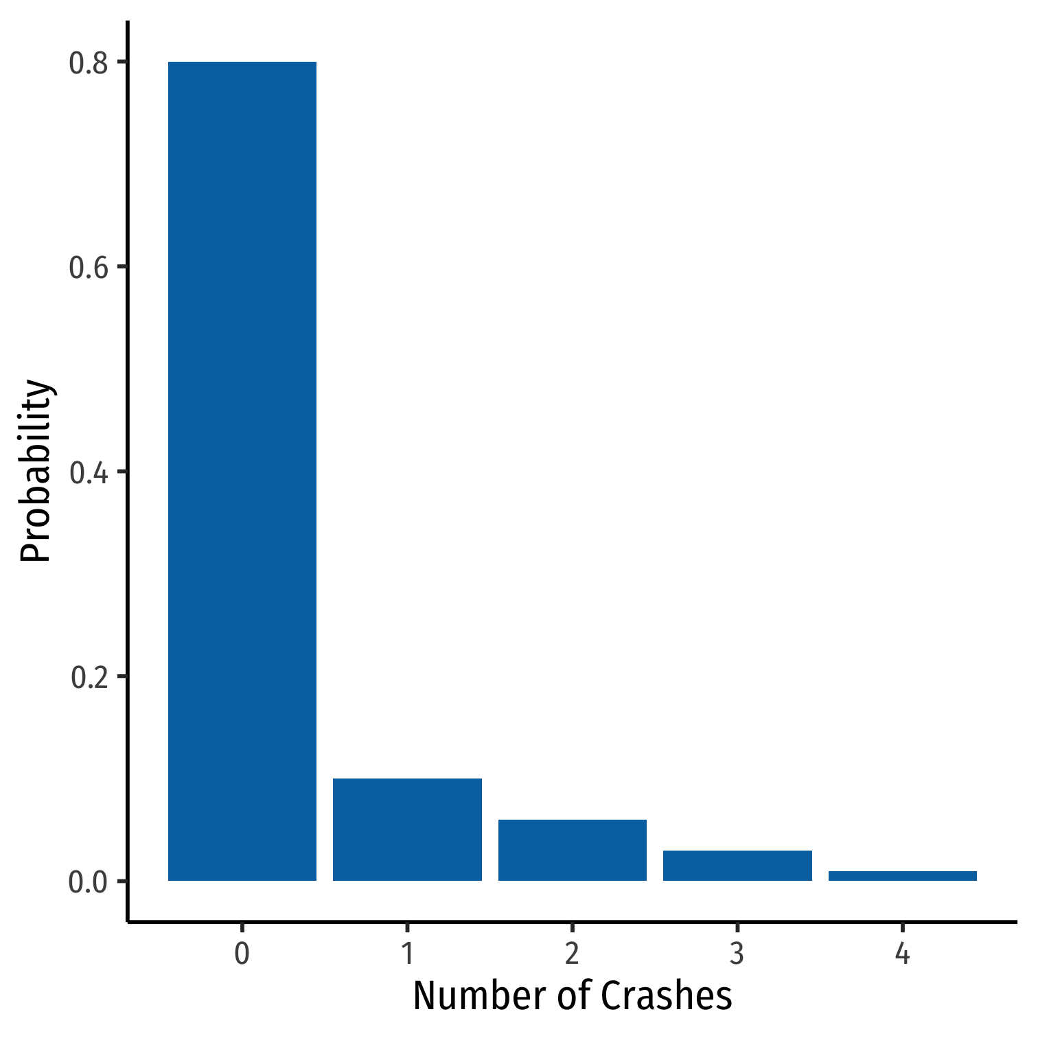 crashes<-tibble(number = c(0,1,2,3,4), prob = c(0.80, 0.10, 0.06, 0.03, 0.01))ggplot(data = crashes)+ aes(x = number, y = prob)+ geom_col(fill="#0072B2")+ labs(x = "Number of Crashes", y = "Probability")+ theme_classic(base_family = "Fira Sans Condensed", base_size=20)