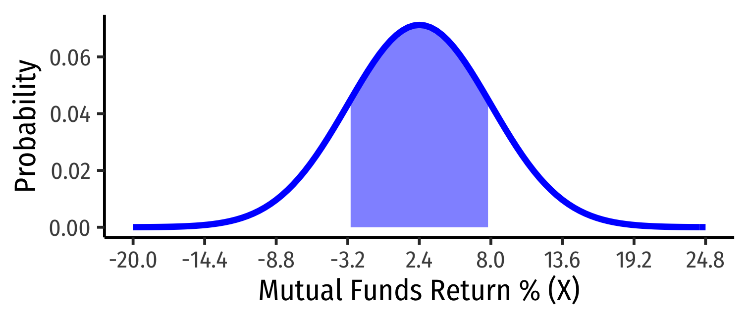 Example: In the last quarter of 2015, a group of 64 mutual funds had a mean return of 2.4% with a standard deviation of 5.6%. These returns can be approximated by a normal distribution.