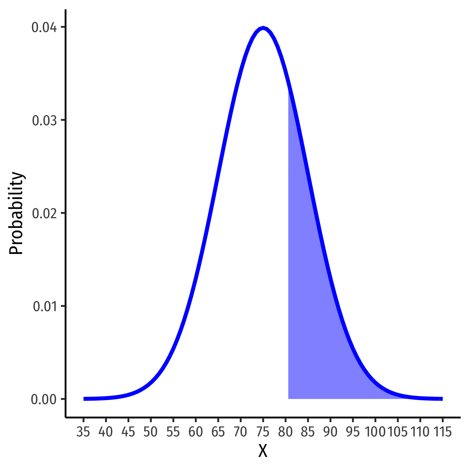 pnorm(80, mean = 75, sd = 10, lower.tail = FALSE) # looking to right