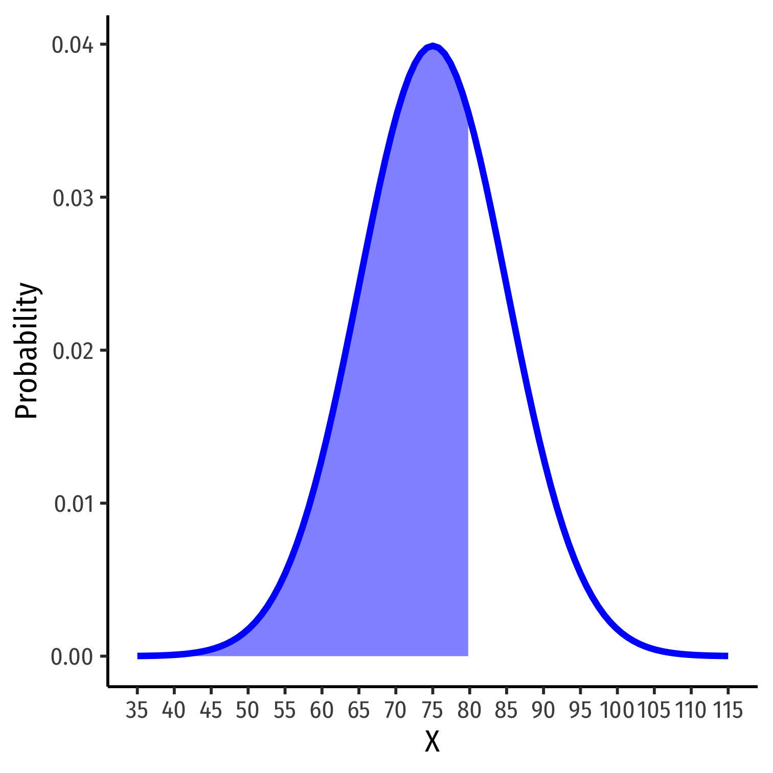 pnorm(80, mean = 75, sd = 10, lower.tail = TRUE) # looking to left