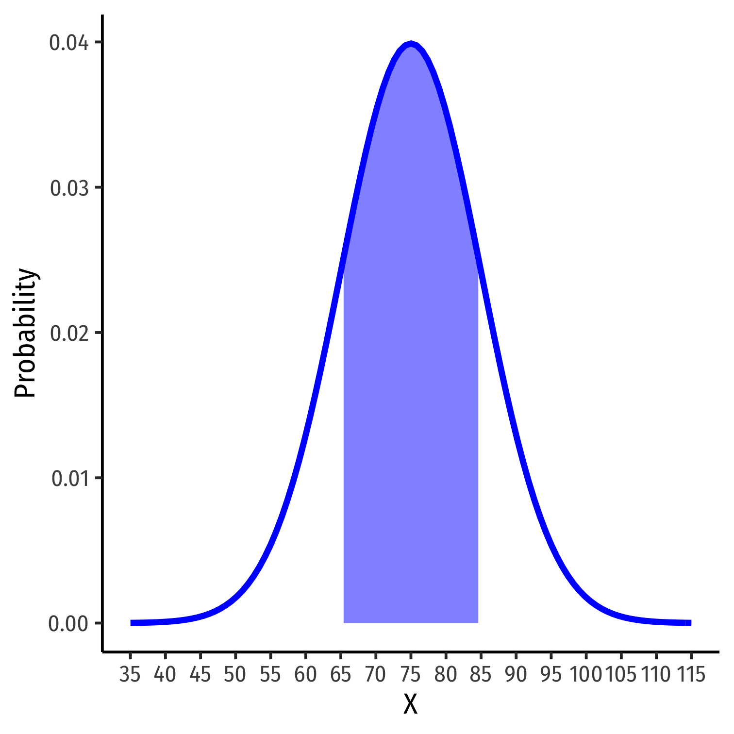 # subtract two left tails!pnorm(85, # larger number first! mean = 75, sd = 10, lower.tail = TRUE) - # looking to left, & SUBTRACT pnorm(65, # smaller number second! mean = 75, sd = 10, lower.tail = TRUE) #looking to left