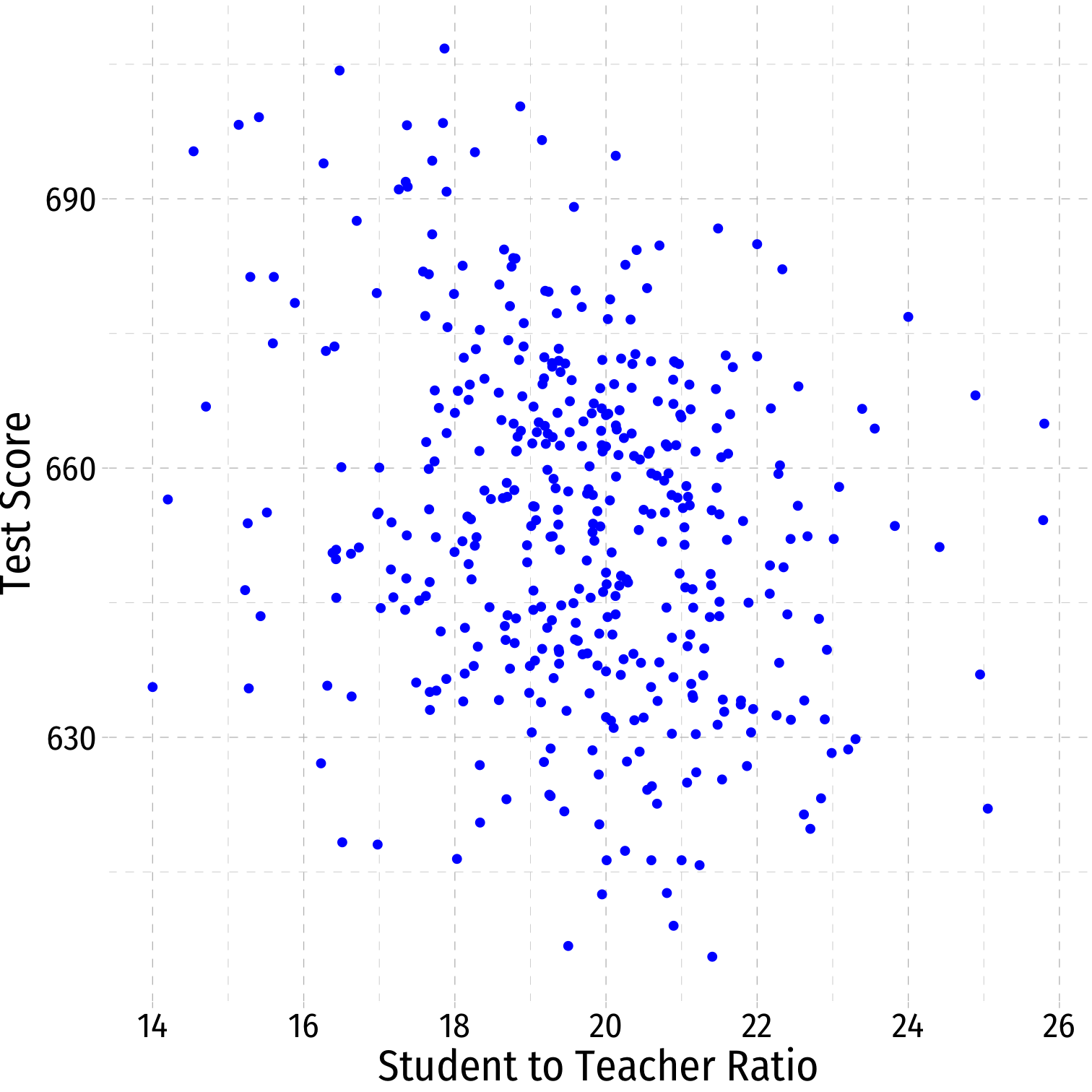 scatter <- ggplot(data = CASchool)+ aes(x = str, y = testscr)+ geom_point(color = "blue")+ labs(x = "Student to Teacher Ratio", y = "Test Score")+ theme_pander(base_family = "Fira Sans Condensed", base_size = 20)scatter