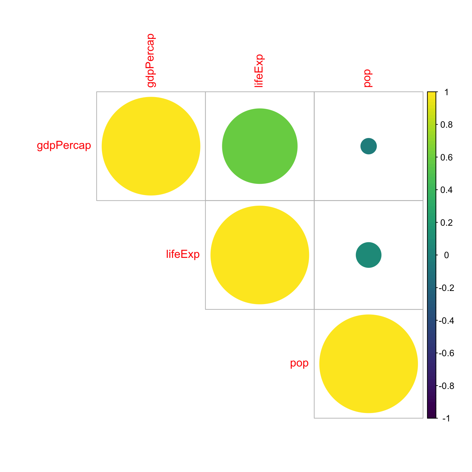 ## gdpPercap pop lifeExp## gdpPercap 1.00000000 -0.02559958 0.58370622## pop -0.02559958 1.00000000 0.06495537## lifeExp 0.58370622 0.06495537 1.00000000corrplot(gapminder_cor_table, type="upper", method = "circle", order = "alphabet", col = viridis::viridis(100)) # custom color