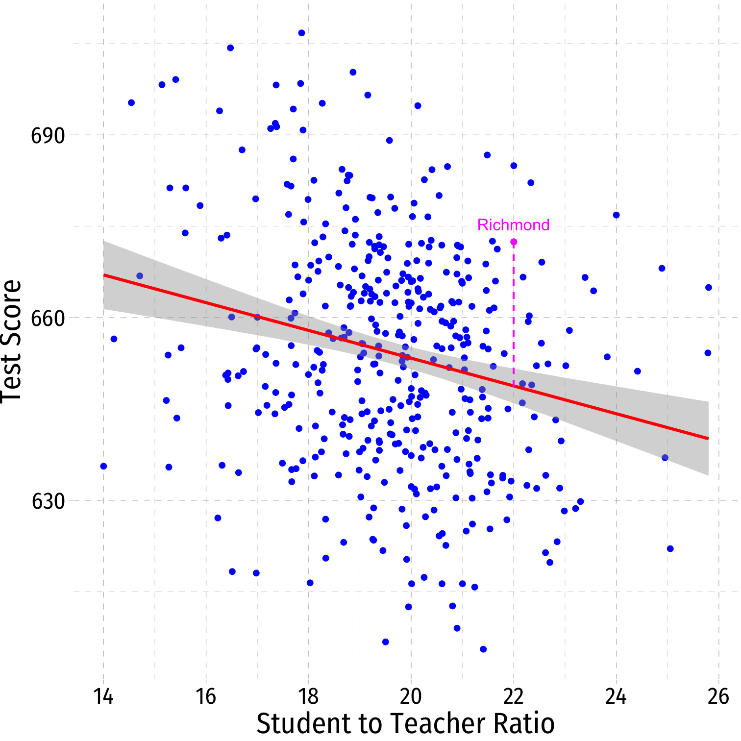 ## # A tibble: 1 x 3## district testscr str## <chr> <dbl> <dbl>## 1 Richmond Elementary 672. 22Predicted value: $$\widehat{\text{Test Score}}_{\text{Richmond}}=698-2.28(22) \approx 648$$