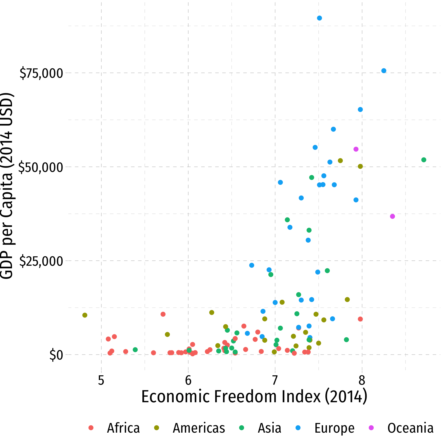 library("ggplot2")ggplot(data = econfreedom)+ aes(x = ef, y = gdp)+ geom_point(aes(color = continent), size = 2)+ labs(x = "Economic Freedom Index (2014)", y = "GDP per Capita (2014 USD)", color = "")+ scale_y_continuous(labels = scales::dollar)+ theme_pander(base_family = "Fira Sans Condensed", base_size=20)+ theme(legend.position = "bottom")