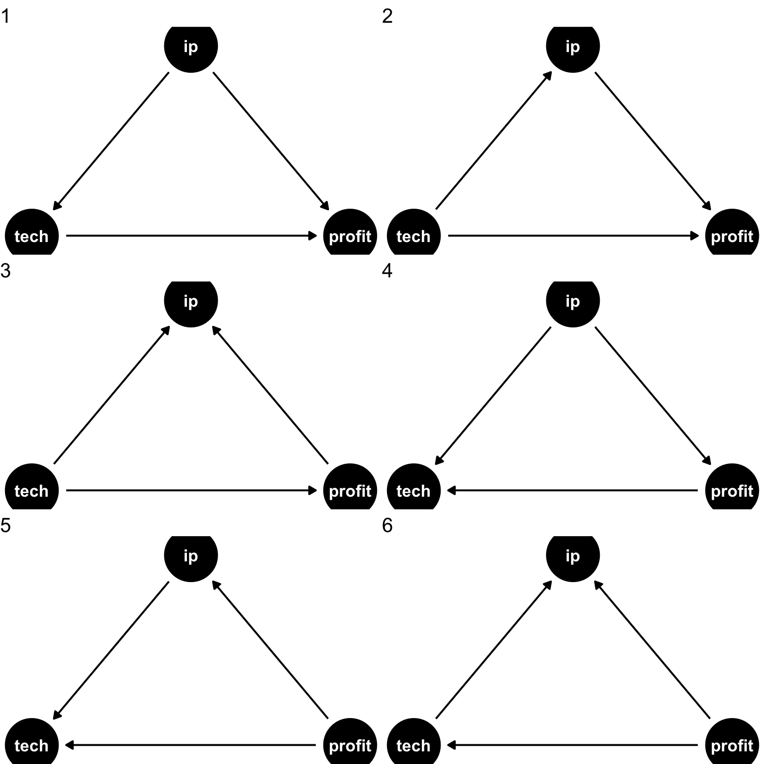 IP: how much a firm spends on IP lawsuits tech: whether a firm is in tech industryprofit: firm profitsThey are all correlated with each other, but what's are the causal relationships?